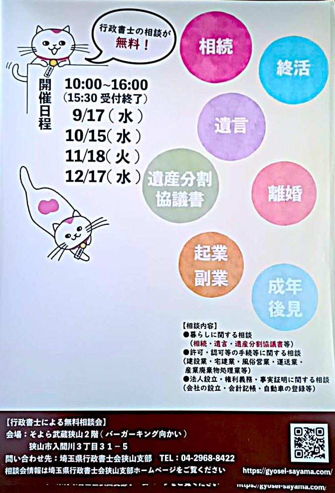 令和7年 10~12月そよら武蔵狭山にて無料相談会の開催予定 先日の9/17(水)そよら武蔵狭山にて無料相談会にお越しいただきありがとうございました。 10~12月の無料相談会の日程をお知らせいたします。詳しくは下記をご覧ください。 お気軽にお越しください。